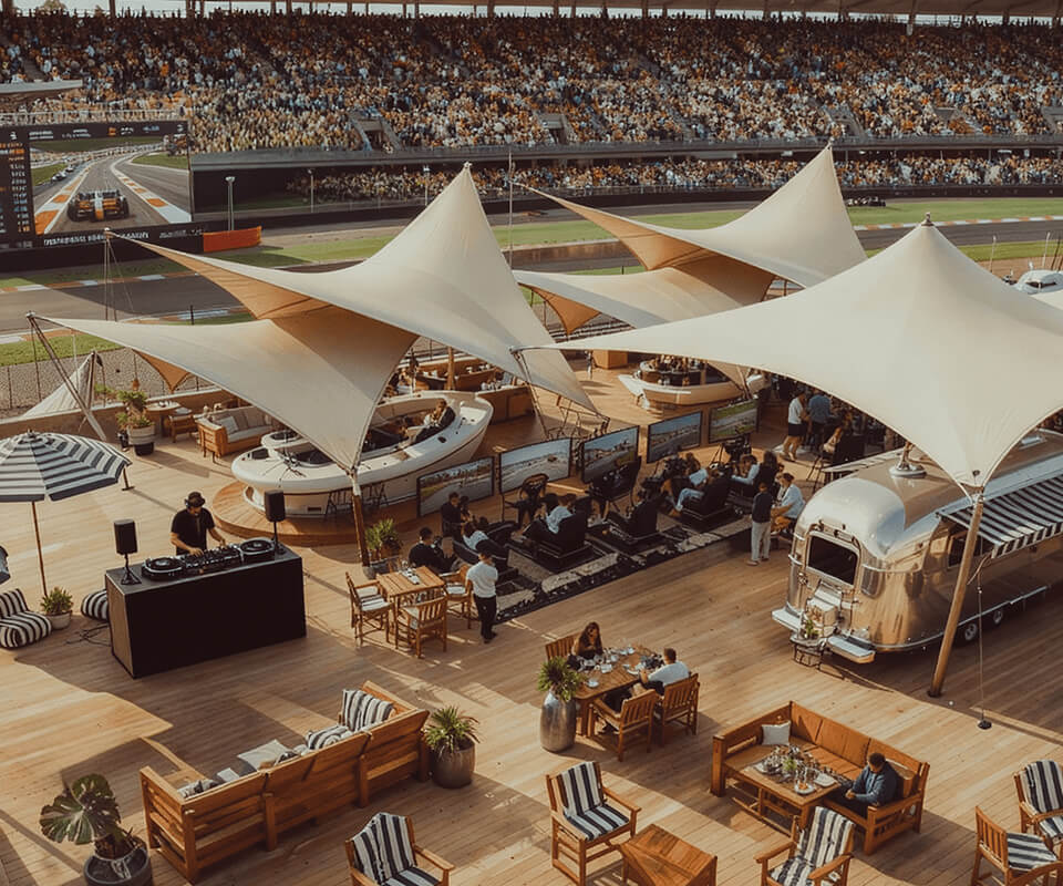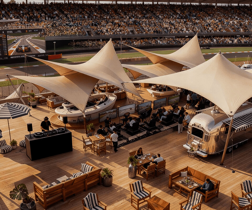 Vive tu fin de semana de F1® en El Mirador, un oasis al aire libre inspirado en los clubes de playa mediterráneos, fusionado con la emoción de la curva peraltada “La Monumental”.